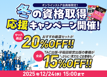 【 冬の資格取得応援キャンペーン 開催中!! 】 TAC出版・早稲田経営出版書籍15%OFF!! セット20%OFF!!(独学道場等一部除く) ダウンロード版書籍もさらにお得に!!