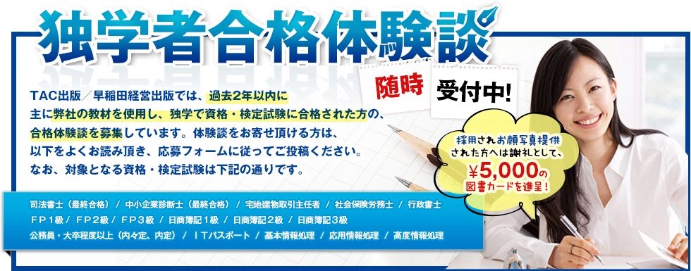 - いただきました合格体験談は、TAC出版オンラインストア「合格体験談」ページや、独学道場リーフレット等へ掲載させていただく場合がございます(その際はご連絡いたします)。