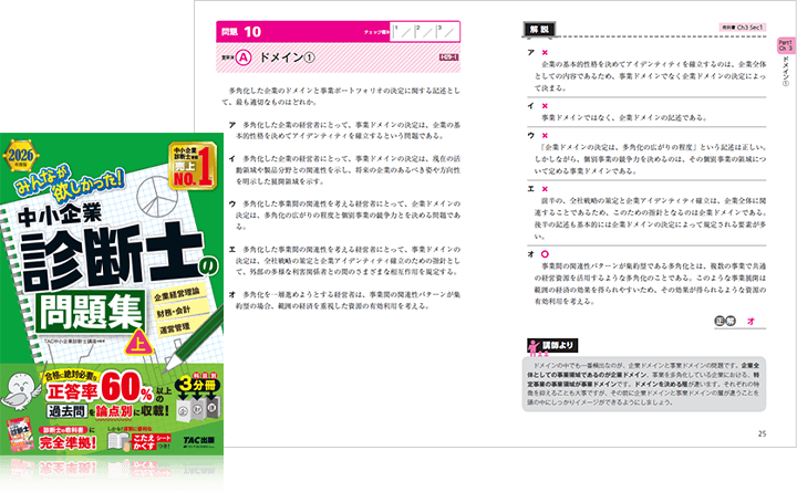教科書のミニテストで基本的な内容がマスターできたら、同シリーズの「中小企業診断士の問題集」にチャレンジしてみましょう。問題集は、直近の中小企業診断士第1次試験問題から、試験対策上、特に重要なものをピックアップして、論点別に収載しています。